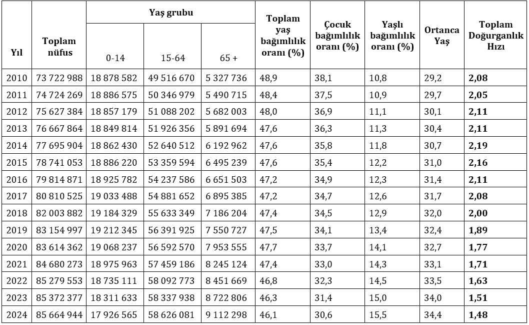 Ülkemizdeki nüfusun son yıllardaki artış hızının hedeflenen düzeyde gerçekleşmediği bilinen bir gerçektir. Tablo 1’de yer alan bilgilere göre son 3 yıldaki genel nüfusun 85 milyon civarında olduğu görülmektedir. Toplam doğurganlık hızındaki azalmanın bu durumun ortaya çıkmasına doğrudan etkisi olduğu anlaşılmaktadır.