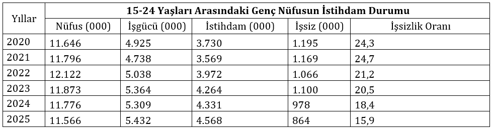 Tablo 2’de de görüldüğü üzere yıllar itibariyle 15-24 yaş aralığındaki genç işsizlik oranları azalış göstermektedir. Bu durum istihdam yapısı açısından önemli olmakla birlikte 2022 yılında 12.122.000 olan genç nüfusun 2024 yılında 11.566.000’e gerilediği anlaşılmaktadır. İstihdamın genel durumunun geleceği açısından olumsuz bir işaret şeklinde yorumlanabilir.